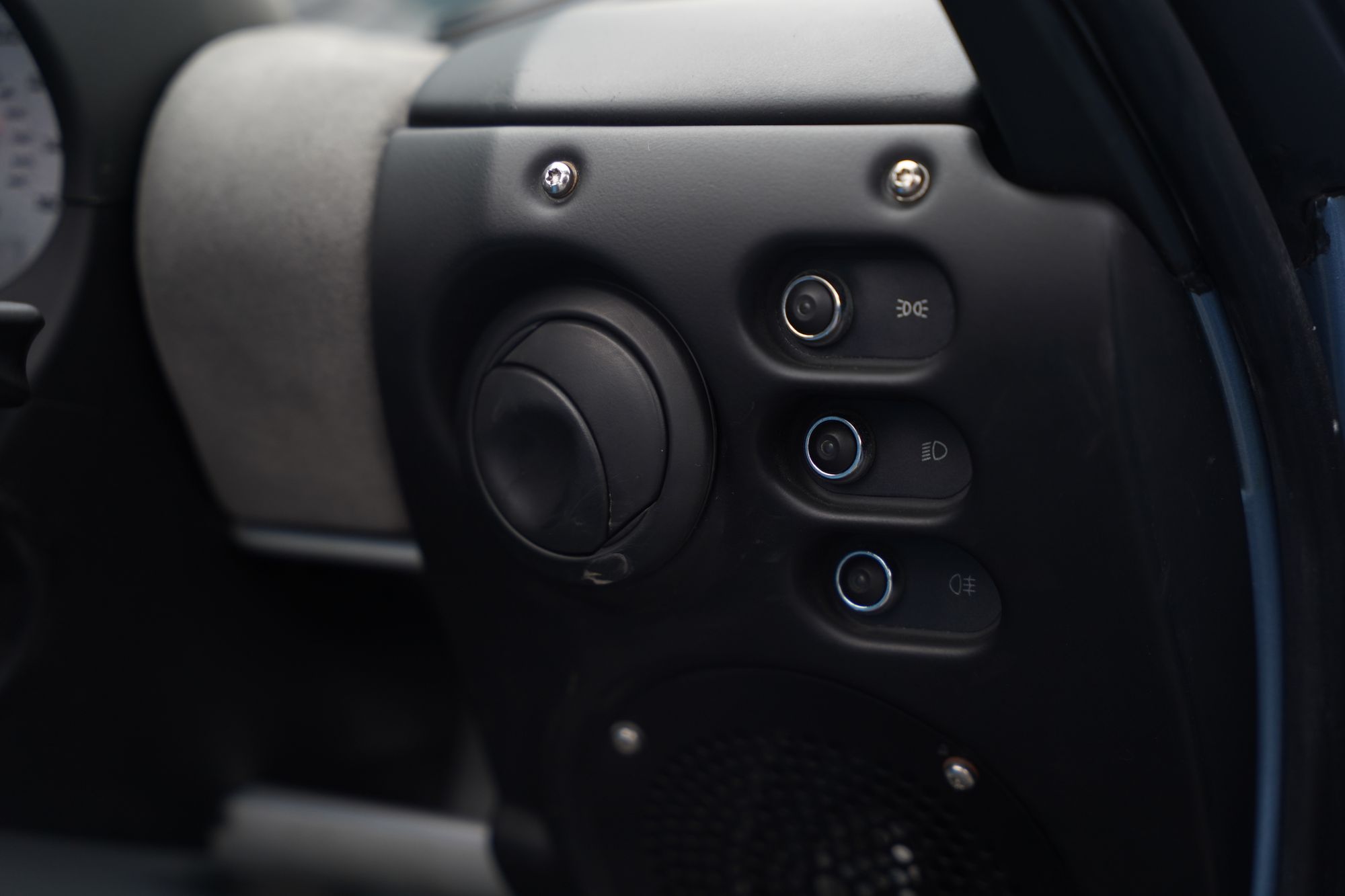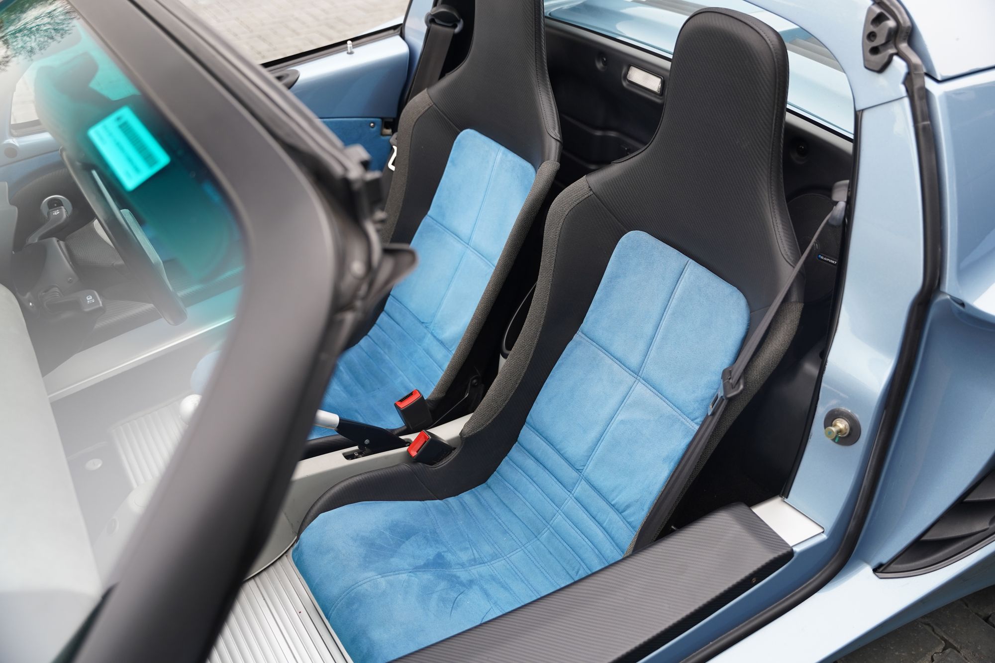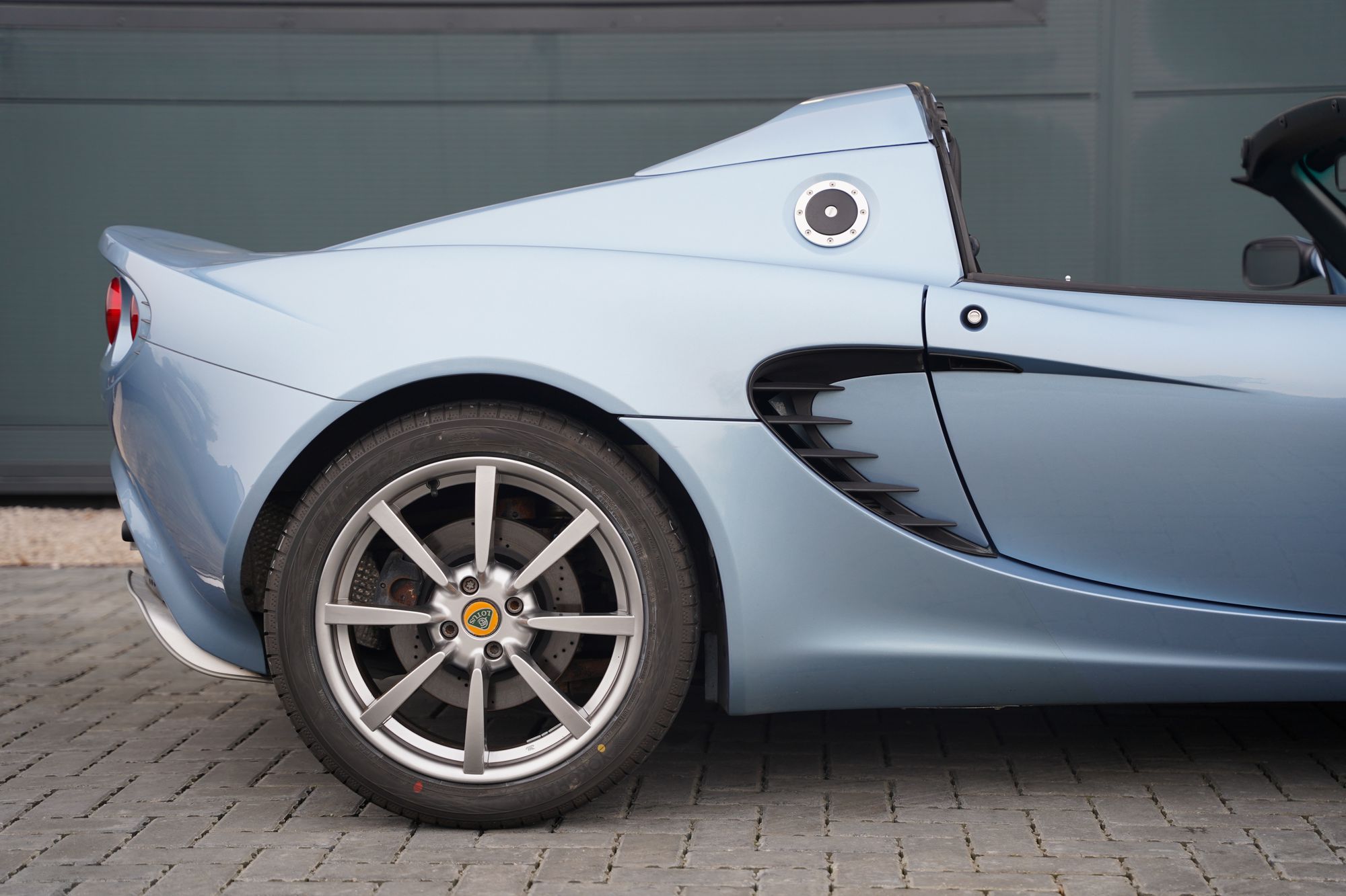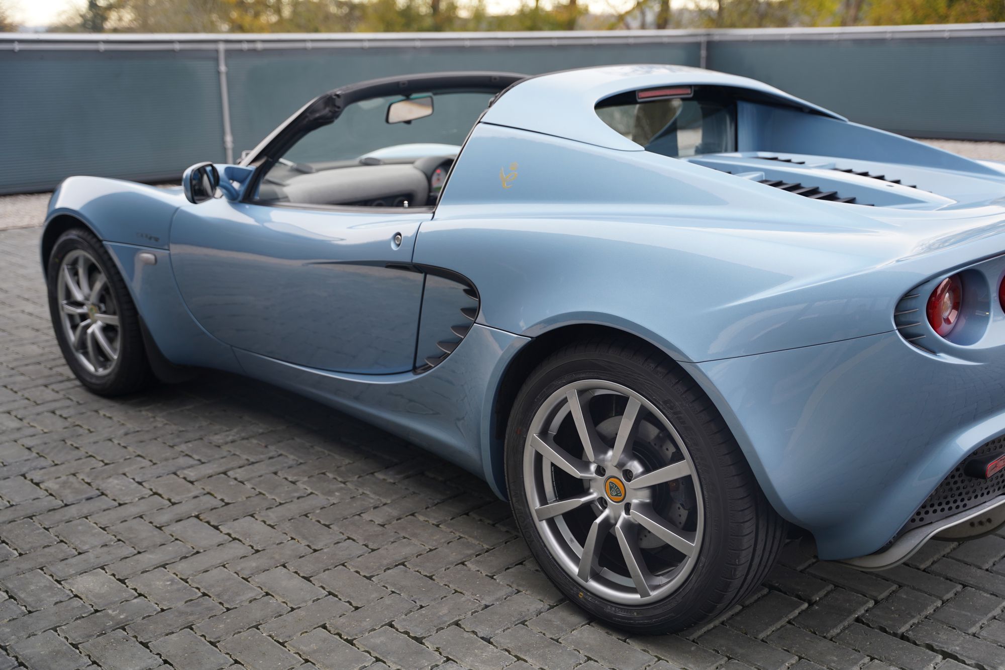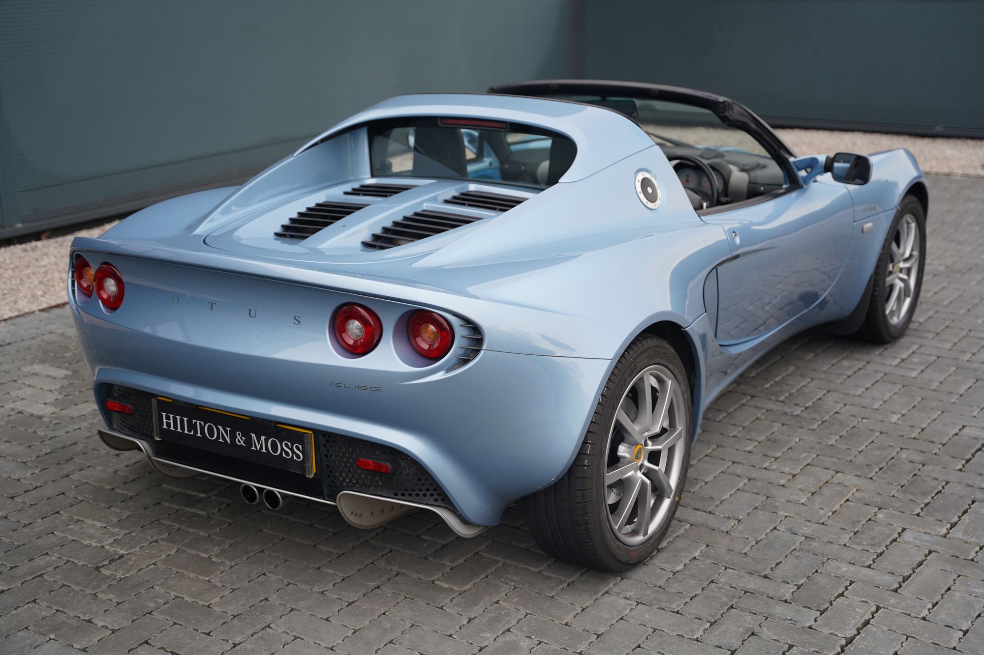 Finished in the elegant colour of Polar Blue (B110) with a complimenting black leather and blue Alcantara interior, this Elise stands out from the crowd. The soft top is also finished in a subtle navy to continue the theme. Specified with the Touring Pack, this brings to the car auxiliary front driving lights, Alcantara trim, soft-top with sound and thermal insulation, electric windows, an upgraded Blaupunkt Woodstock stereo, interior storage net, sound insulation and carpet set with a lightweight aluminium passenger foot rest.