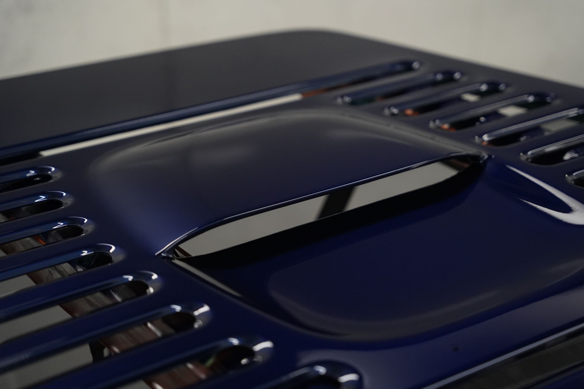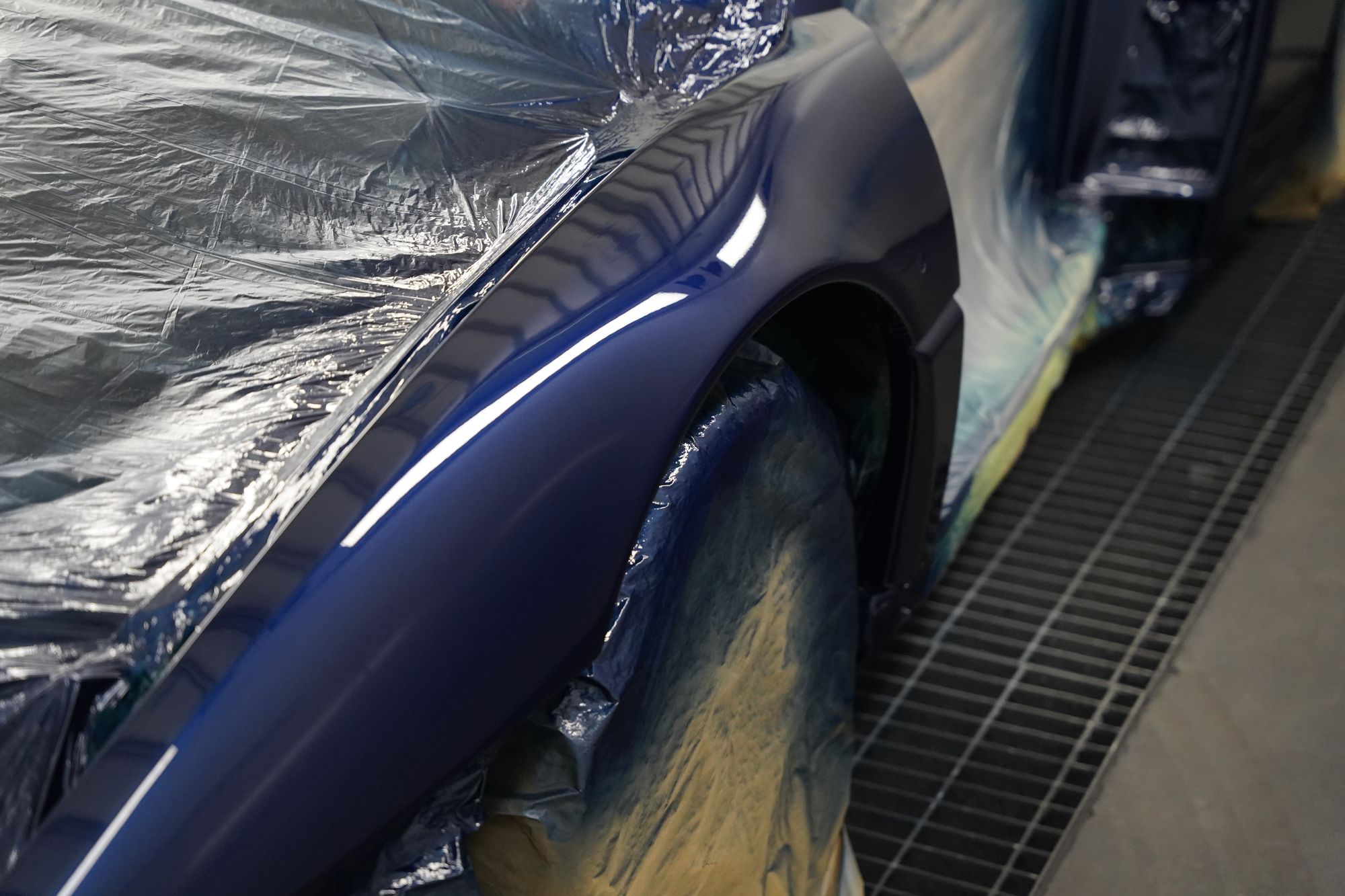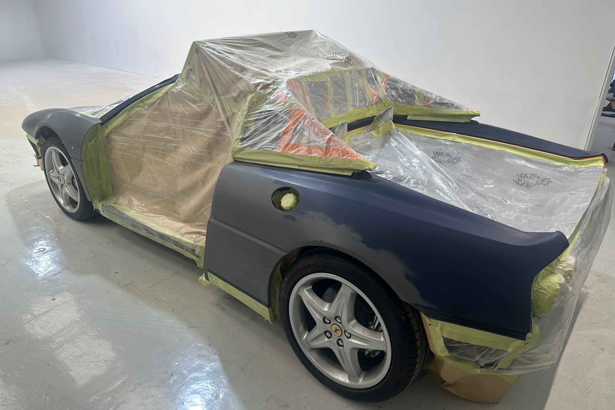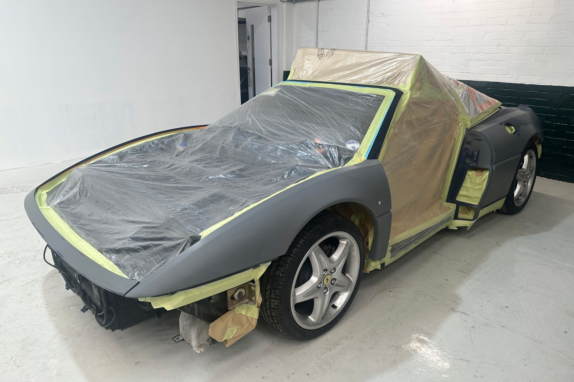 This beautiful F355 is finished in one of the most striking colours, Le Mans Blue. The commission for this car was to visually refresh the paintwork after many years of stone chipping and use. After a comprehensive disassembly, a detailed parts list was compiled to ensure smooth reassembly. With this era of sports car, many plastic trim clips were used that became brittle over time, so all were replaced during assembly with genuine Ferrari items. The bodywork of the car was carefully assessed for previous repairs and damage before primer and paint preparation by our expert team. As with all older vehicles, they do not respond well to repeated cold starts, so we used the latest equipment from Stringo to transport the car into our paint shop without running the engine.