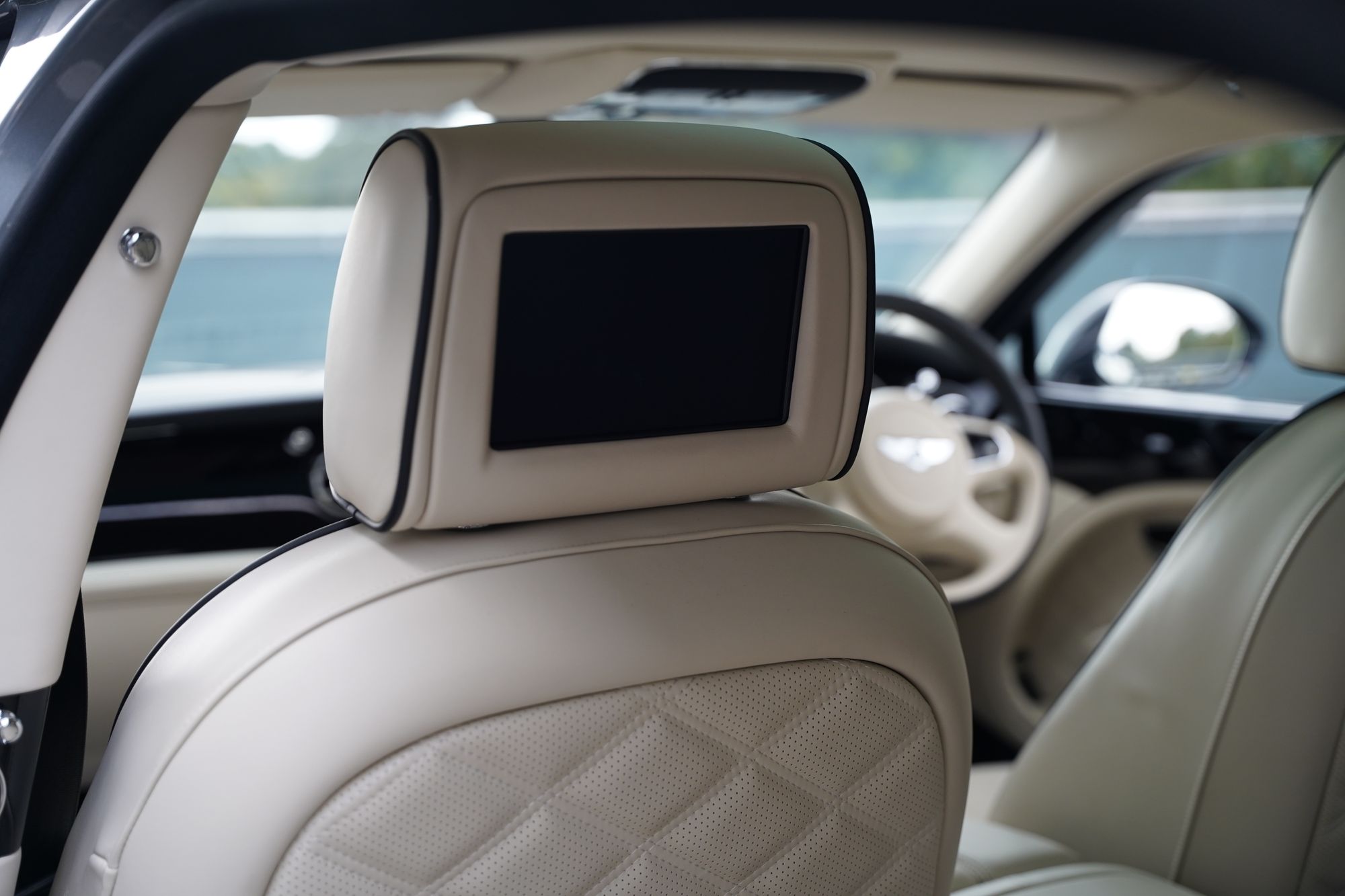The technology in this Bentley is nothing short of comprehensive. The front seats adjust fully and electrically (14-way with memory), and are of course heated with a massage function. A central screen serves as the base for navigation, radio, media, phone and vehicle settings. The screen can be hidden behind a Piano Black veneer panel if desired, leaving just the lower panel to adjust essential controls. A large glass sunroof panel sits above the front half of the cabin, with deployable shade cover.