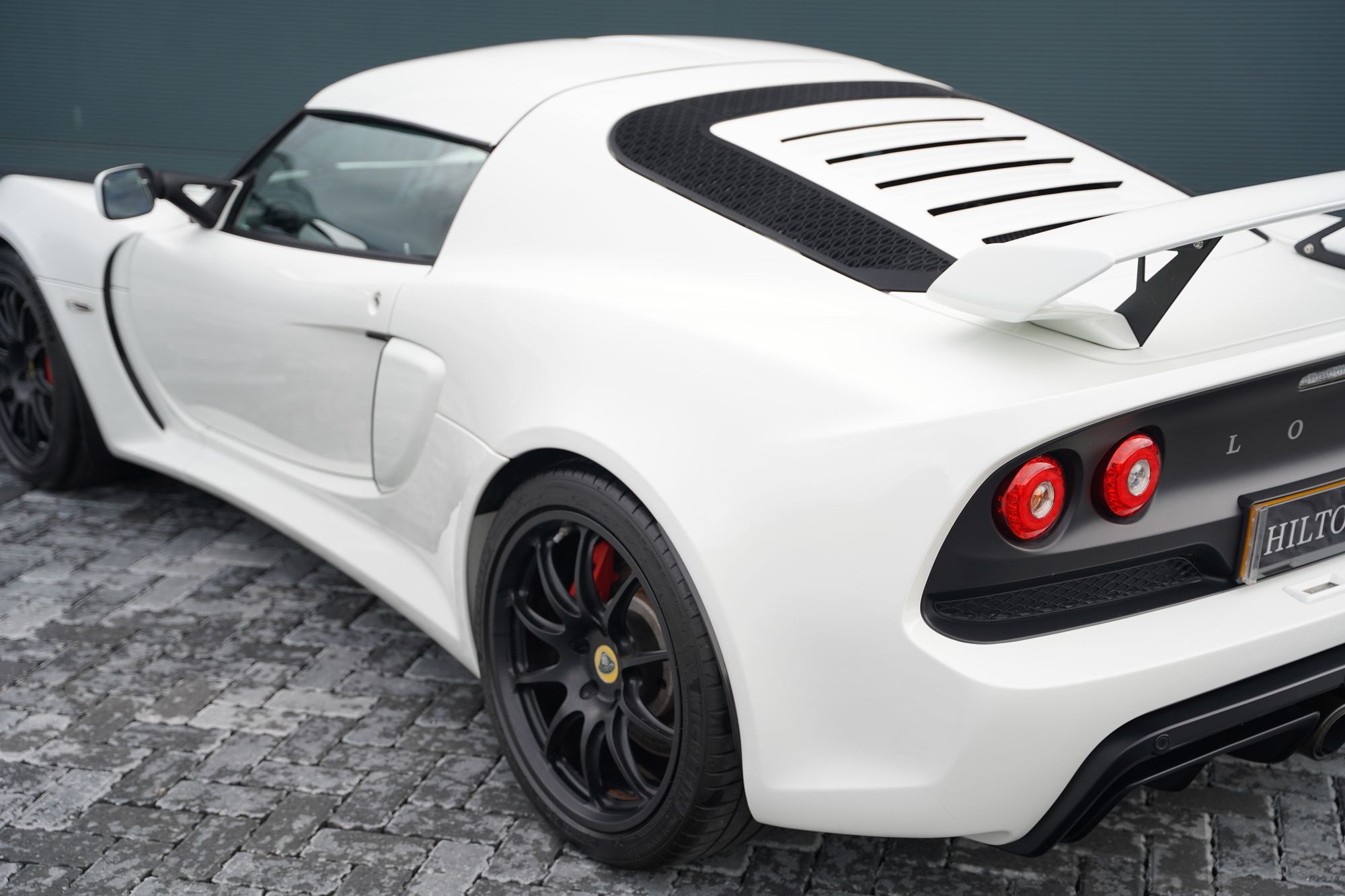 This particular Exige Sport 350 is finished in stunning Metallic White, specified with ultra-lightweight Black forged aluminium wheels and Red brake callipers.